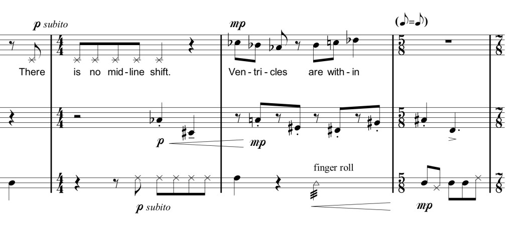 MS: Yes, heโs wonderful. The text for “Unremarkable Brain” is not lighthearted, but itโs definitely got some moments where it isnโt meant to be taken too seriously, which was an intentional choice. So itโs for that reason that I had those lines spoken. I think it was “Incidental cystic lesion / There is no midline shift.” Those were a pairing in the MRI report, so thatโs part of the reason that I had those phrases spoken. Part of it was intuitive, because I wanted a break in the sound. It was a lot of singing and I wanted to break that up a little bit. The other reason is because it adds to that idea that this isnโt meant to be taken too seriously.